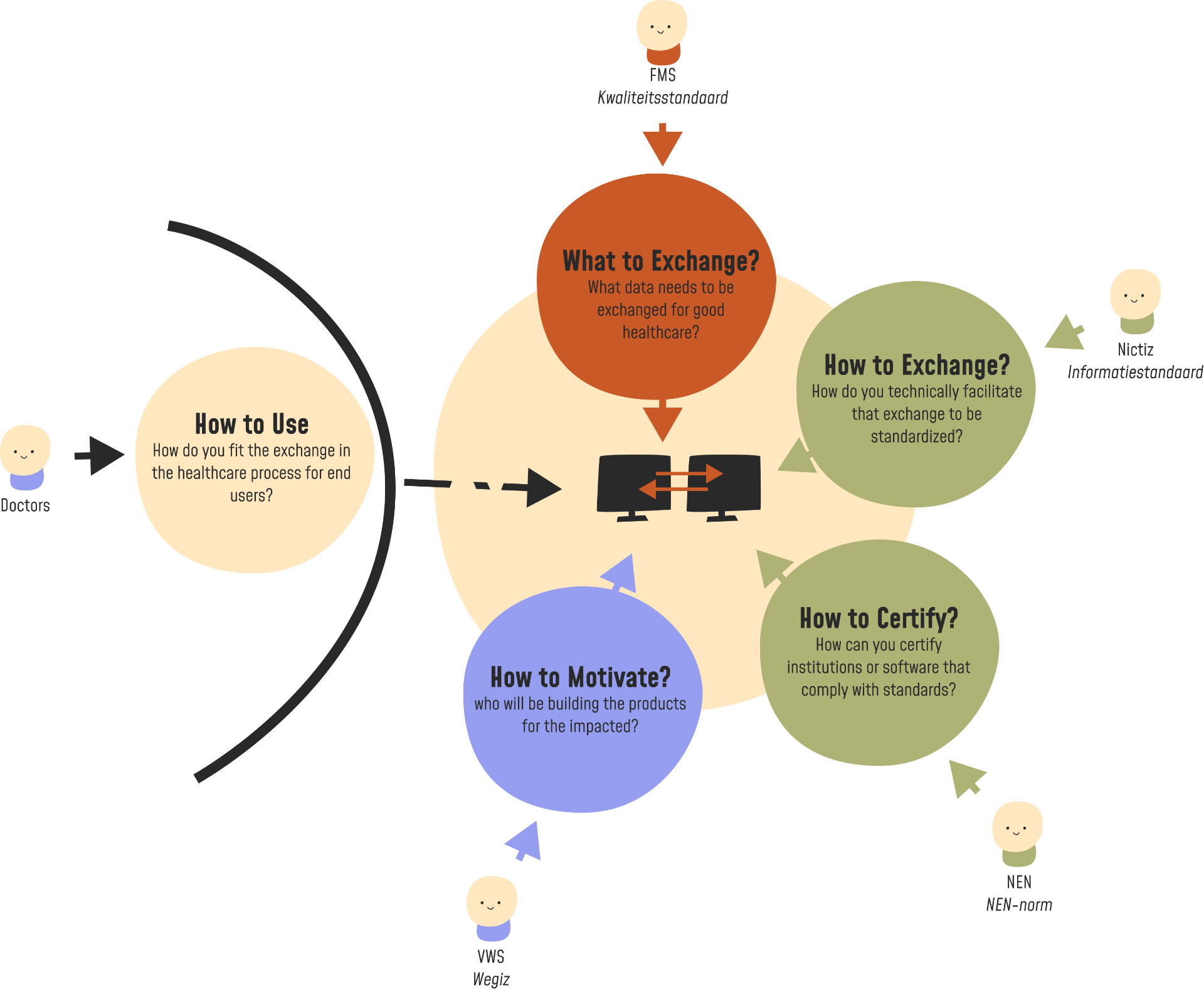 Om tot een interventie ontwerp te komen heb ik het gehele systeem in kaart gebracht, waarvoor ik diepgaande interviews heb gehouden met mensen uit alle hoeken van het systeem. Van arts tot beleidsmedewerker tot technisch analist. Op basis hiervan heb ik de focus gelegd op een nieuwe werkgroep, de Nictiz 'Designathon'. Hier heb ik oberservaties en interviews gehouden om mijn interactie-ontwerp te testen en itereren.